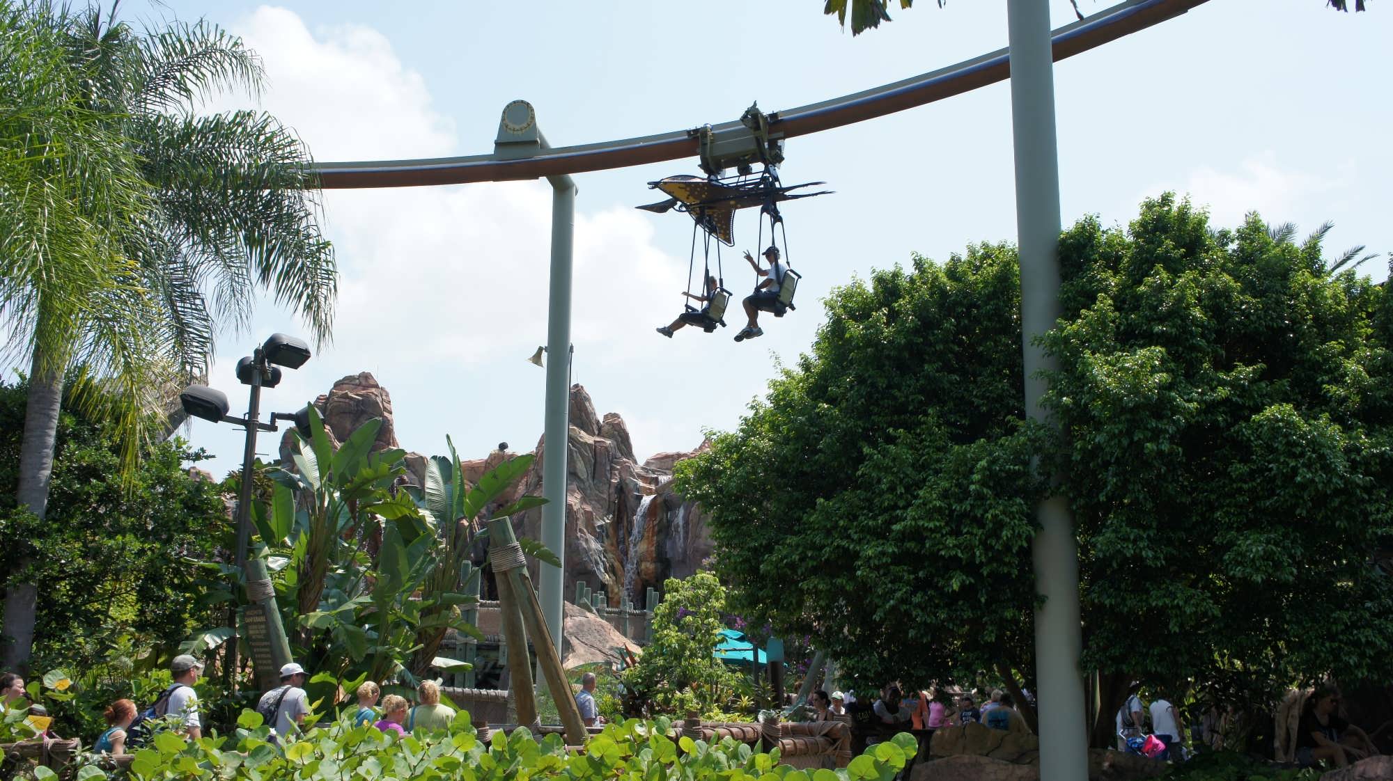 | Grandma and Grandpa rode Jurrasic Park River Adventure while Brinley and I rode the Pteranodon Flyers. Landon and Jennifer played at another playground. This was the most terrified that I was during the entire trip. The Pteranodon Flyer was a two person ride in which each person was in their own chair. They only had seat belts across your waist which made me absolutely terrified. I have seen this Houdini (Brinley) get out of much more secure devices and this just didn't seem safe enough. Against my better judgement I went ahead and got on. Brinley absolutely loved it! Below is a picture of the ride (it is not us) to show exactly what the ride looked like. |